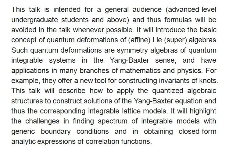 报告题目:Quantized (Super)algebras, integrable systems and Application