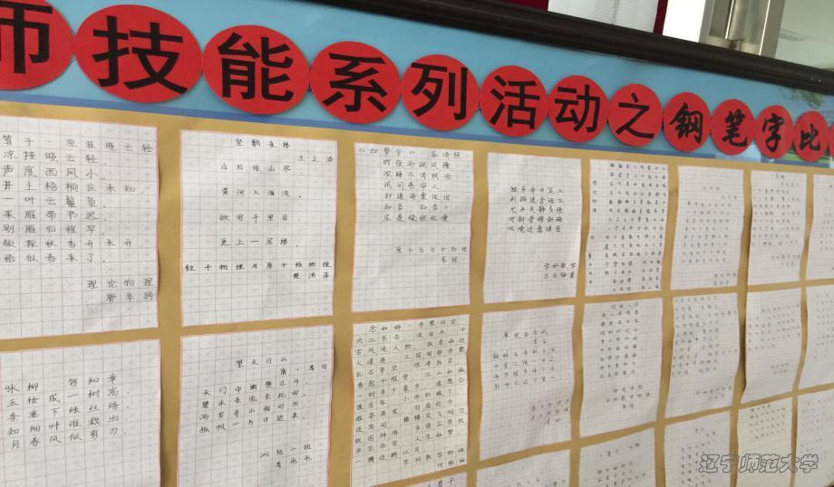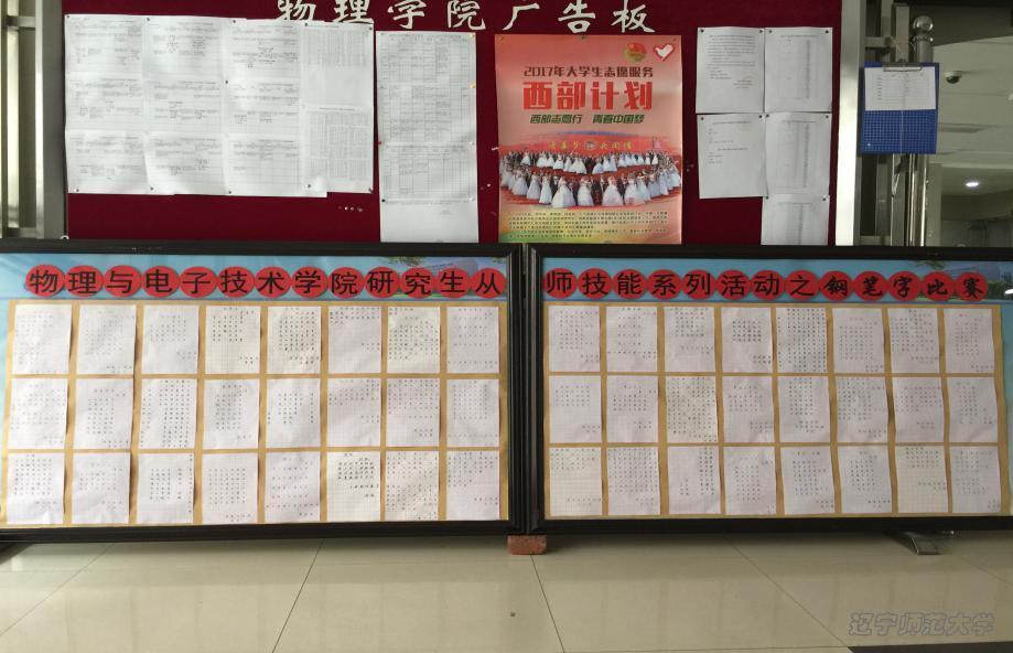 于2017年4月11日举办研究生从师技能系列活动之钢笔字比赛。此次钢笔字比赛共收到作品48份,或遒劲有力,或挥洒自如,充分展现研究生的书法功底,现已展出于理化楼A区一楼大厅。