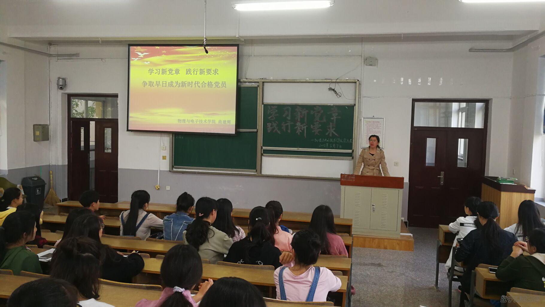举办了第68期党校培训班第一次培训,党总支书记曲建辉做了题为《学习新党章 践行新要求 争取早日成为新时代合格党员》的专题讲座。党总支副书记李孝君、团委书记贾舒涵以及68期培训班的全体入党积极分子和拟发展对象参加了本次培训。