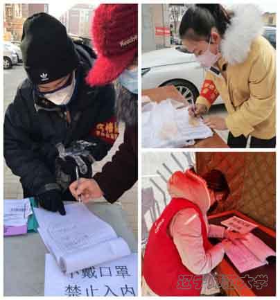 ’时,我都倍感骄傲!虽然无法奋战在疫情第一线,但我可以在另一片战场上做一些力所能及的事情,加入社区的防疫志愿者队伍是我的使命,我必须要站出来,为阻断病毒而‘逆行’!”一位志愿者这样说。在这个特殊的寒假里,对外来人员和车辆进行登记、排查,拦截快递外卖员,检查居民戴口罩情况、发放口罩、测量体温,到户宣传疫情防控措施等等,成为了志愿者的日常工作,常常一干就要到晚上7、8点才结束。天气冷时冻得瑟瑟发抖,遇到固执的居民,沟通困难、不被理解……但这些都没有阻挡志愿者“逆行”的脚步。截至3月11日,本科生党支部共有6名党员在抗疫志愿者报名表上坚定地写下了自己的名字:刘琳、田鑫、吴敬贤、魏雨佟、任洹妤、吴桐霏。在他们的影响和感召下,嘟嘟成人网