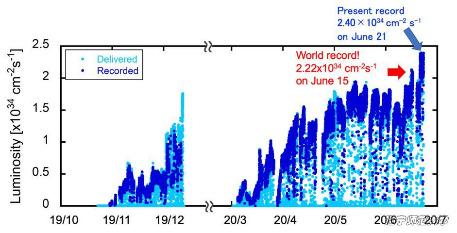 2020年6月15日, 日本高能加速器研究机构(KEK)的SuperKEKB对撞机取得了2.226×1034 cm-2s-1的瞬时亮度。该亮度刷新了此前由欧洲核子研究中心(CERN)的大型强子对撞机(LHC)于2018年创造的2.14 ×1034 cm-2s-1的纪录。6月21日, SuperKEKB对撞机的亮度得到进一步提高,已经达到2.40×1034 cm-2s-1的瞬时亮度。
