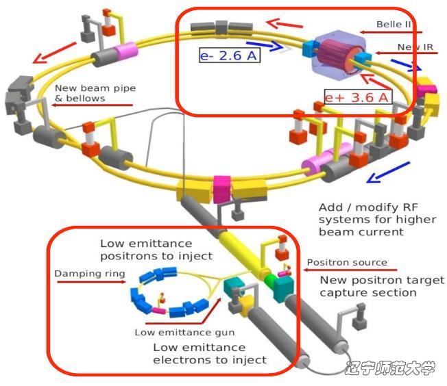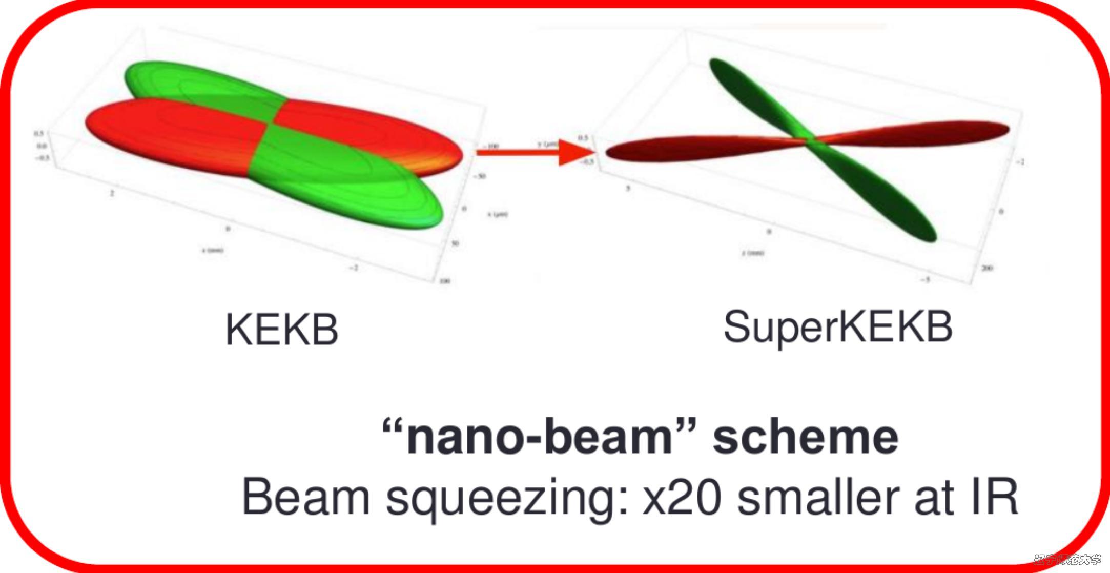 对撞亮度是指粒子束团对撞过程中,单位时间单位横截面内发生对撞的粒子数量。因此,更高的亮度意味着更高的数据采集能力,是对撞机最核心的性能指标之一。SuperKEKB的设计亮度高达8 ×1035 cm-2s-1,是当前亮度纪录的约40倍!为保证这一史无前例的技术指标能够顺利实现,SuperKEKB计划使用的束流强度约为KEKB的两倍,在设计上则首次采用了新的“纳米束”方案(“nano-beam” scheme),即在正负电子束团对撞区域将束团垂直方向尺寸压缩至50纳米左右(即一个普通病毒的尺寸),使束团垂直方向变得更致密,从而增加对撞的有效截面,提高对撞亮度。另一个影响对撞亮度的重要因素是正负电子的束流强度,通过增强束流强度可显著提高对撞亮度。目前,束团的尺寸只压缩至220纳米左右,获取亮度纪录时的束流强度还不到KEKB的1/2,这意味着SuperKEKB的亮度在未来还有很大的上升空间。