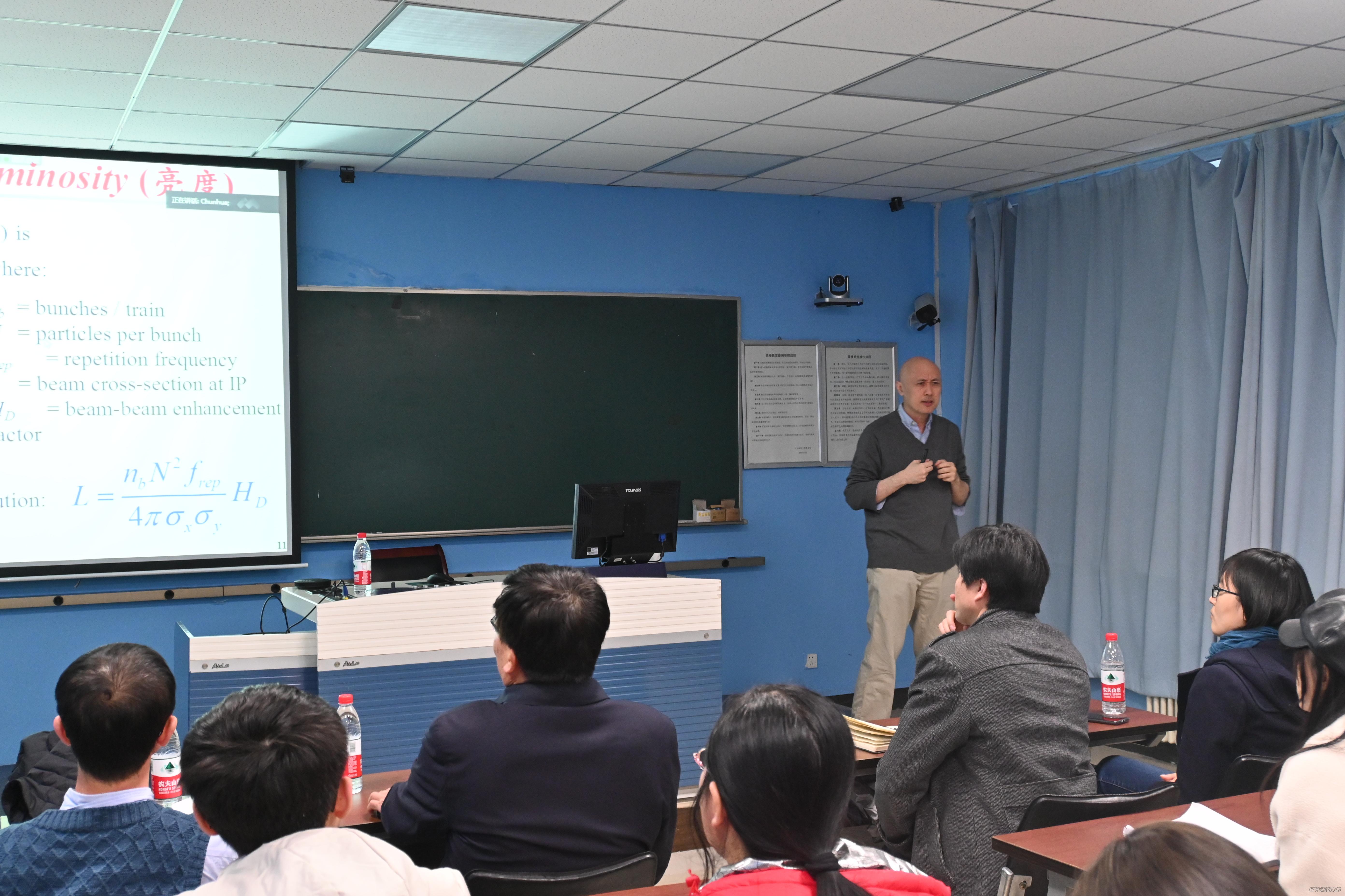 郑阳恒教授首先向同学们介绍了从事正负电子对撞机相关研究对物理学发展的重要意义,以及相关领域对人类社会进步的重大贡献,并向同学们介绍粒子物理研究的前沿实验方法、手段,以及非微扰强相互作用及强子内部结构研究的一些最新进展,并介绍了我国科学家正在推动的下一代高亮度正负电子对撞实验“超级tau-粲装置”(STCF)项目。