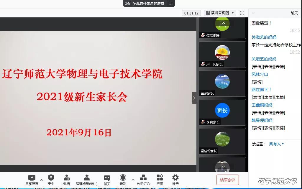 党委书记曲建辉老师、院长孙景昌老师、党委副书记雷鸣老师、副院长陈建兴老师、副院长王玉新老师、副院长赵振华老师以及2021级全体新生家长参加了此次云端家长会。会议由雷鸣老师主持。