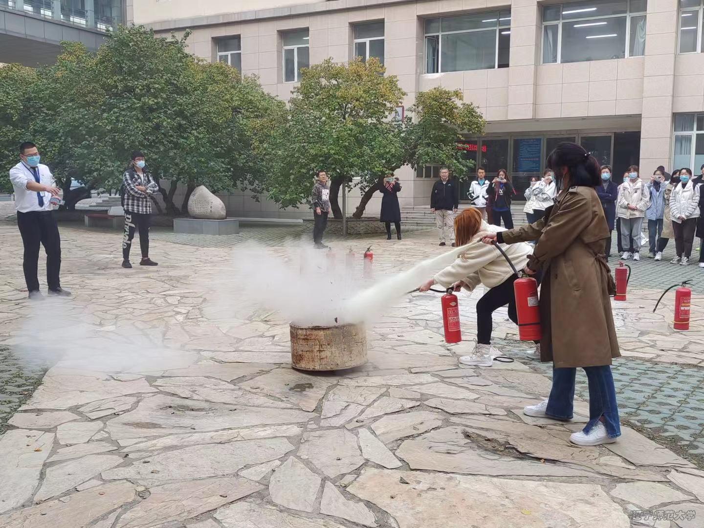 师生进行了应急逃生疏散演练,并在理化楼前的空地上现场学习和练习了消防器材的正确使用方法。