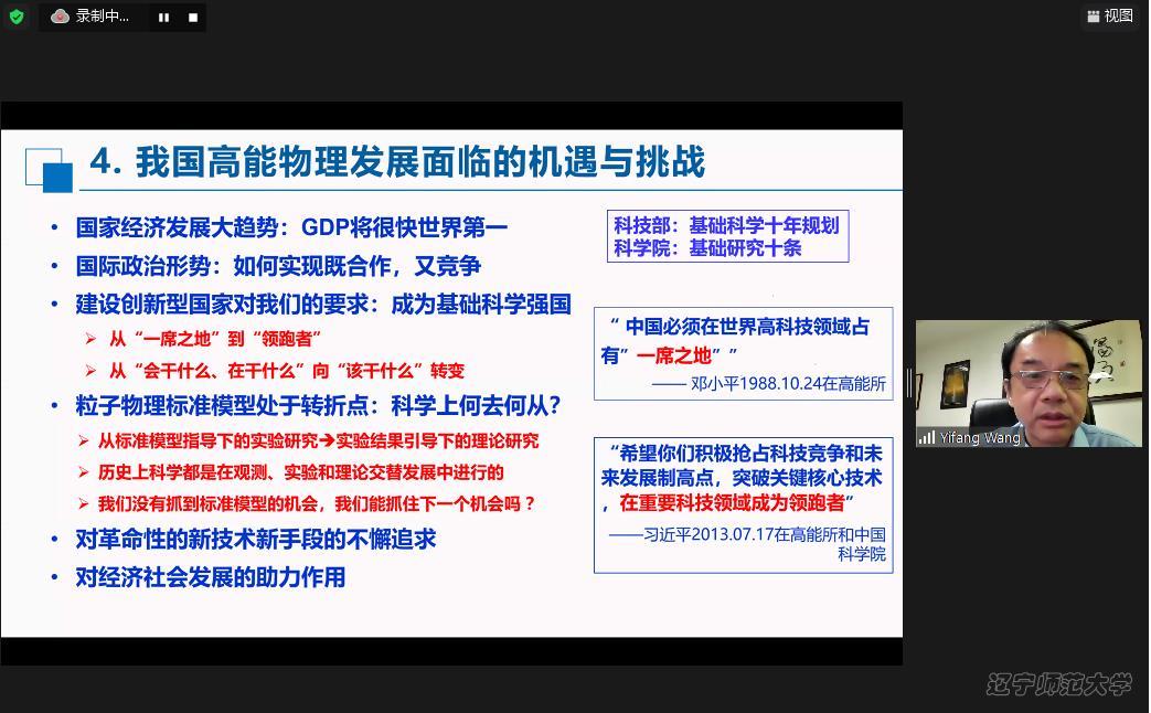 大科学装置规划,高能物理期刊与科普工作情况,指出了我国高能物理发展面临的机遇与挑战,提出了一些值得深入思考的问题。王贻芳院士号召学界共同努力承担科技强国责任,在学术研究、人才培养、国际合作、学科发展规划中发挥更大的作用,推动我国高能物理研究实现与科技强国研究并跑和部分领域研究领跑。