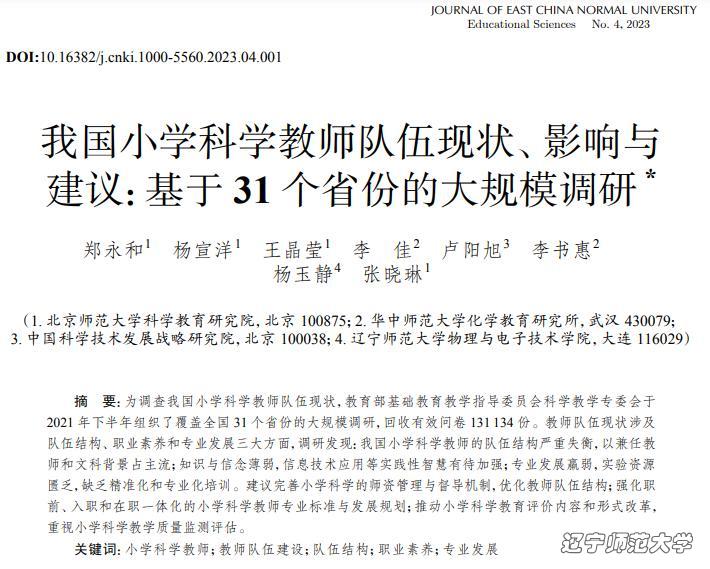 (物理)专业硕士杨玉静与北京师范大学科学教育研究院院长郑永和教授、华中师范大学化学教育研究所李佳副教授等人,联合撰写了以《我国小学科学教师队伍现状、影响与建议:基于31个省份的大规模调研》为题的学术论文,该论文发表于《华东师范大学学报(教育科学版)》2023年第四期。论文发表以来,受到学术界和各级教育管理部门的广泛关注。