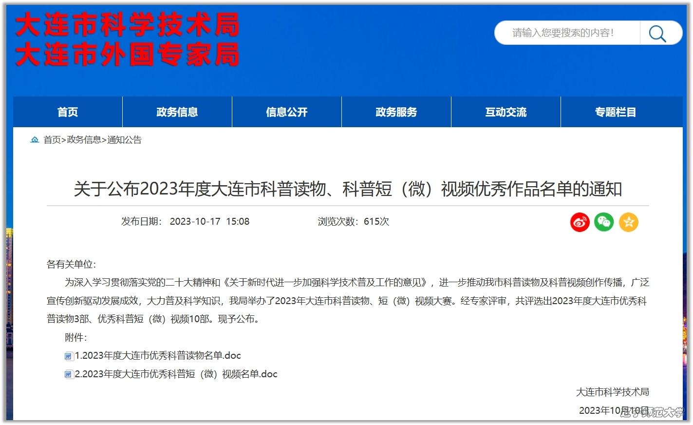 在2023年度大连市科普读物、科普短(微)视频大赛中取得优异成绩