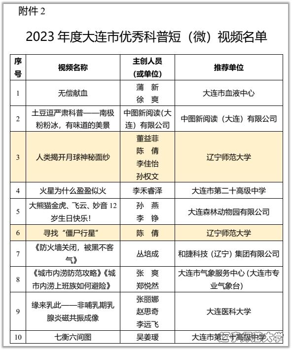 Spaceteam科普工作室的2件科普视频作品《人类揭开月球神秘面纱》和《寻找“僵尸行星”》荣获2023年度大连市优秀科普短(微)视频(本年度共10件短视频获奖)。
