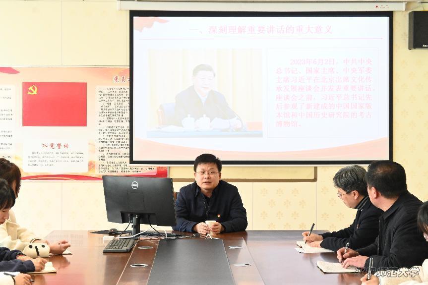 徐昭峰副校长以习近平总书记在北京出席文化传承发展座谈会上的重要讲话精神为出发点,从“深刻理解重要讲话的重大意义、深刻把握中华文明的突出特性、深刻理解‘两个结合’的重大意义、更好担负起新的文化使命”四个方面进行了深入讲解,阐述了中华文明具有的连续性、创新性、统一性、包容性、和平性,解读了把马克思主义基本原理同中国具体实际、同中华优秀传统文化相结合是必由之路的原因,并指出担负新的文化使命,就是要坚定文化自信、秉持开放包容、坚持守正创新,激扬自信自强的精神力量,展现更加积极的历史担当。
